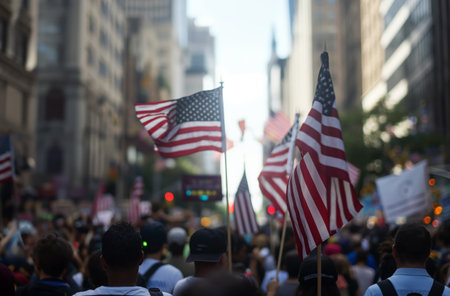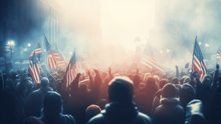 Blurred crowd out of focus standing at a city political protest, celebration or event waving american United Stated flags.