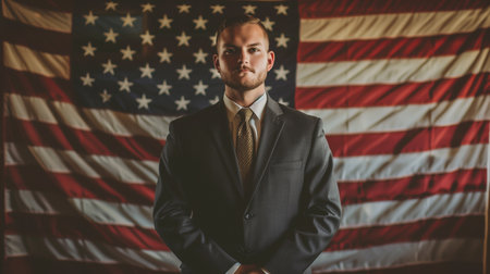 Portrait of confident businessman in suit and tie standing on american flag background