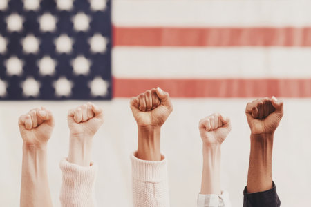 Multiple hands with raised fists show solidarity and unity in front of a blurred American flag, symbolizing strength, activism, and diversity.