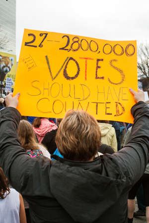 Atlanta, GA, USA - January 21, 2017: A man carries sign that says 2,800,000 votes should have counted as he walks in the Atlanta march for social justice and women, the day after President Trump's inauguration, on January 21, 2017 in Atlanta, GA.