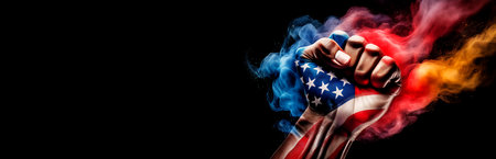 Extreme closeup of a hand closed in a fist painted with the colors of the American National Flag (USA flag), and multicolored smoke on a black background with copy space. Generative Ai.