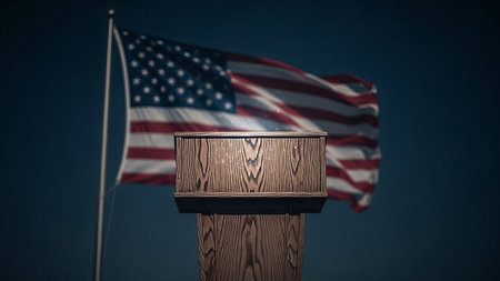 Empty podium with US flag, ready for speaker. Freedom, debate, politics.