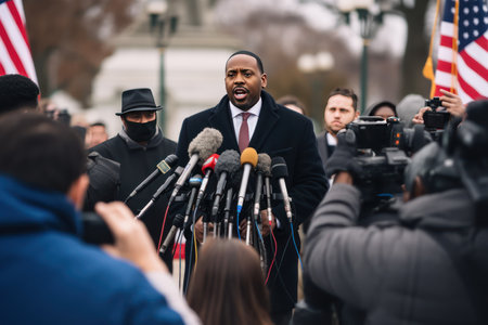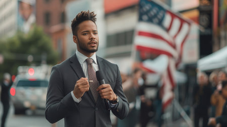 Male Reporter Preparing for Live Election Broadcast, A sharp-dressed black male reporter with a microphone stands against a blurred backdrop of American flags, ready for a live election broadcast.