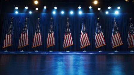 united states flags standing on a stage under blue spotlights, creating a patriotic and solemn atmosphere