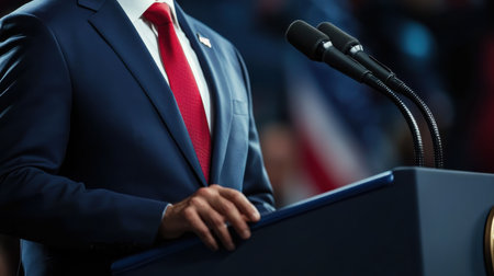 A man wearing a suit and red tie stands at a podium with microphones, preparing to deliver a speech to an audience. The atmosphere is formal and focused, highlighting the importance of the address