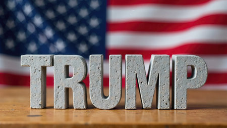 Gray concrete TRUMP text on a wooden table with an American flag in the background
