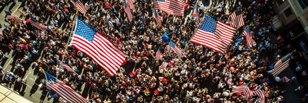 Aerial view of a large crowd of people holding American flags in a city street