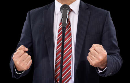 You can feel his passion. Cropped view of a man in a suit speaking into a microphone with his hands in fists.