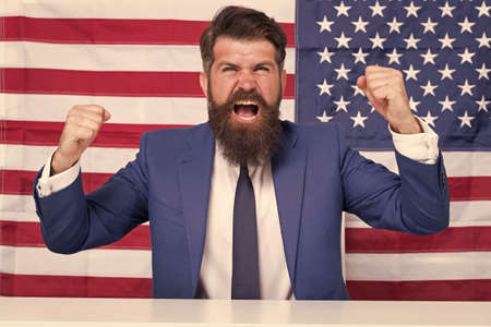 Mature man, speaker and vote with american flag for global economic change, politics or opportunity. Male person, diplomat or politician with mic for public relations or national election in USA