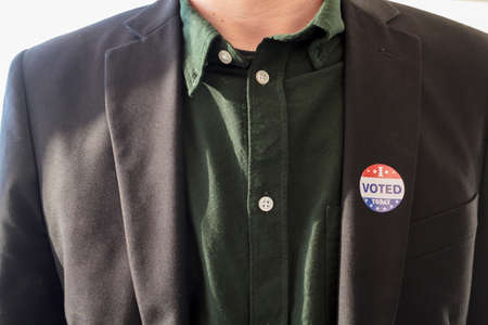 I Voted Today sticker on a man's coat lapel for the US presidential election