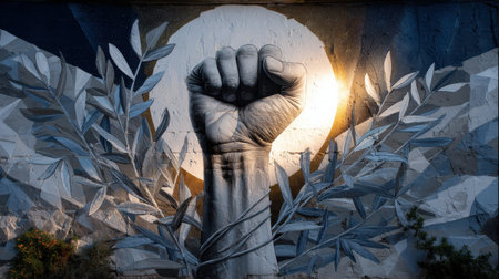 A hand with a fist raised is surrounded by leaves and a sun. Concept of strength and determination