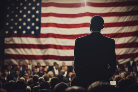 A silhouette of a speaker in front of an audience with an American flag backdrop, conveying a sense of authority and engagement
