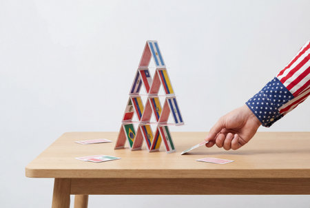 A hand wearing a shirt with the united states flag pattern reaches out to flick a card and collapse a fragile pyramid structure built from playing cards featuring various latin american country flags.