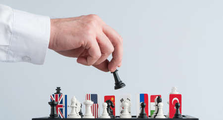 Politician's hand moves a chess piece with a flag. Conceptual photo of a political game. retaliatory move USA