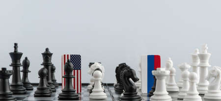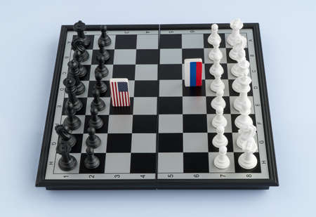 Symbols flag of Russia and the United States on the chessboard. The concept of political game.