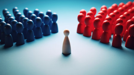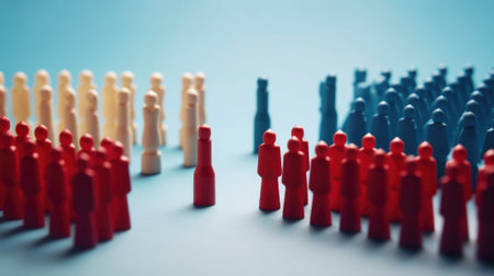 The image captures the tension between two groups of red and blue pawns, epitomizing confrontation and disagreement. The lone blue among the reds adds a vivid narrative to the scene.