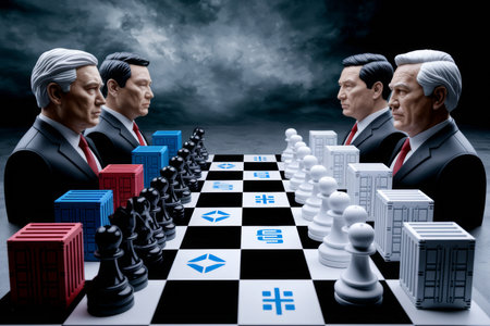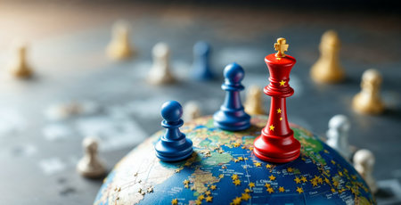 A symbolic chessboard with political figures as chess pieces, representing global strategy, --chaos 30 --ar 16:9 --v 6.1 Job ID: 8bd04226-1701-4881-89a3-25ff56fef333