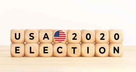 USA 2020 presidential election concept. Wooden block with text and american flag icon. Copy space