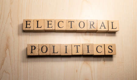 Electoral politics Word from wooden cubes. Economy state government terms. Background made of wooden letters.