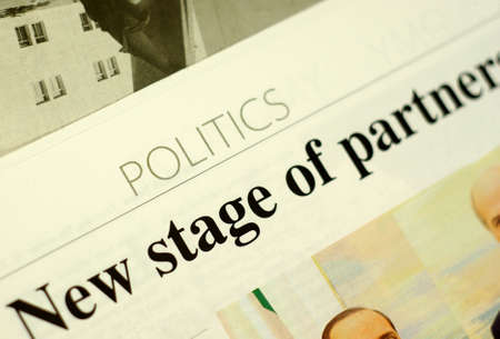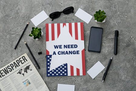 Magazine, business cards, newspaper and mobile phone on gray background. Concept of impeachment