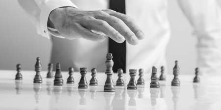 Monochrome image of a businessman holding his hand above wooden chess pieces with king in the front in a conceptual image of business leadership and power.