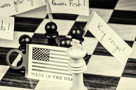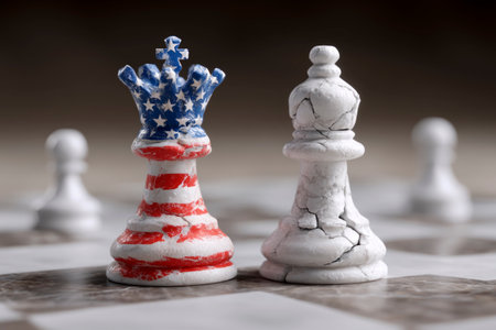 Chess king with american flag facing cracked white king on marble chessboard, representing political or economic challenge