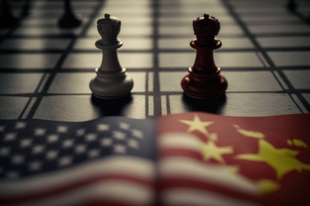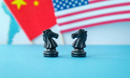 American and chinese knight chess pieces facing off on world map representing international relations. Chess figurines with us and china flags facing off on world map, symbolizing global competition and economic conflict