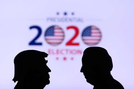 NEW YORK, USA, JUN 17, 2020: Silhouette of republican candidate Donald Trump and democratic candidate Joe Biden. 2020 United States presidential election. US vote, Concept photo for November 3, 2020