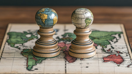 Two chess pawns with globe designs rest on a vintage world map, inviting strategic play.