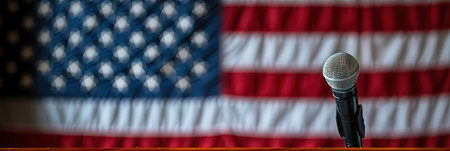 A microphone on stage, blurred background with large American flag on background and audience, dramatic lighting