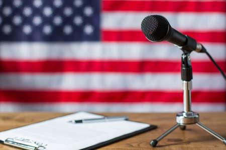 Microphone on blurred flag background. Microphone beside flag of America. Equipment is ready for speech. News for the nation.