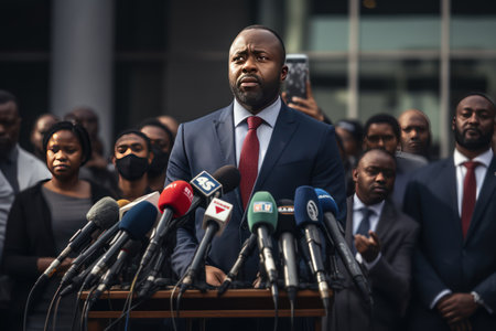 Close-up of African mature speaker standing opposite mcrophones at press conference for television
