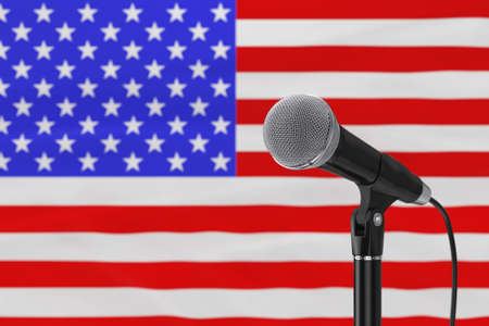 Speech Microphone Stand Against of Blurred USA Flag extreme closeup. 3d rendering