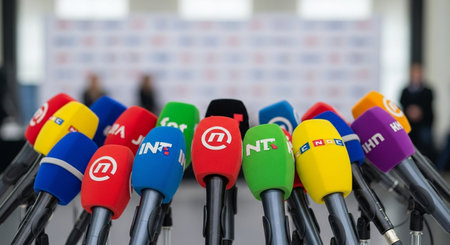 Diverse hands hold vibrant pink blue green and yellow microphones with at a press conference, focusing on communication.