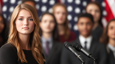 Young Woman Delivers Speech at Government Event in Front of Diverse Audience With Flags in the Background Generative AI