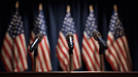 A professional podium featuring two microphones, set against the backdrop of American flags, perfect for political events, press conferences, or public speaking engagements.