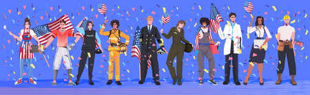 mix race people of different occupations holding USA flags labor day celebration concept
