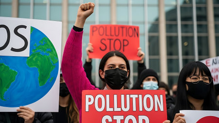 Group of young adults protesting pollution outside a large building, holding signs and wearing face masks