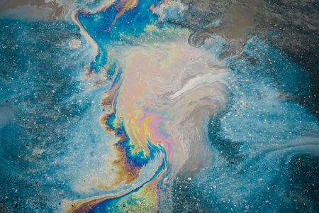 Gasoline or oil spill creating colorful swirls on water surface, polluting the environment and causing ecological damage