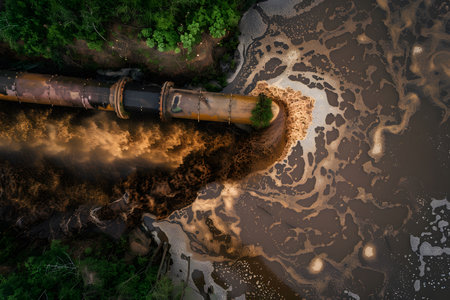 An industrial facility releases brown contaminants into a river, creating a stark contrast against the lush greenery along the banks. This troubling sight highlights environmental concerns.