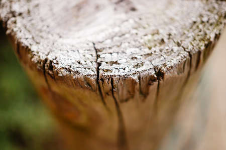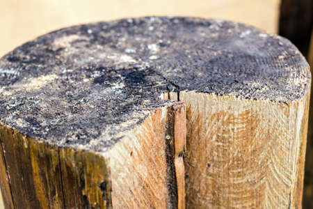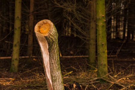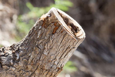 Close up view of a broken tree stump with sharp, splintered wood fibers and rough texture, illuminated by natural sunlight in an outdoor setting.
