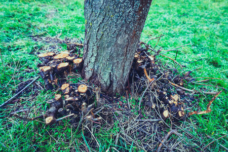 In a serene green landscape, a tree's sturdy trunk stands tall surrounded by cut roots and stumps. The early morning light casts gentle shadows, highlighting nature's raw beauty.