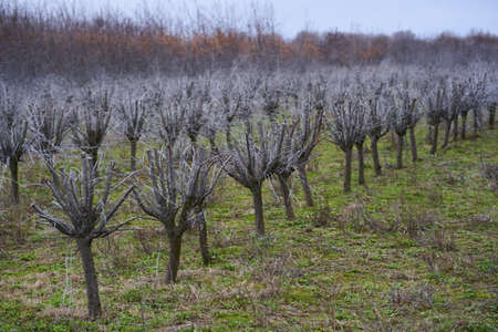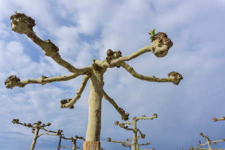 Closeup of jagged trunks with thin, leafless branches of a pollard willow tree against a blue sky with white clouds in the background, woody plant, sunny day in the Netherlands