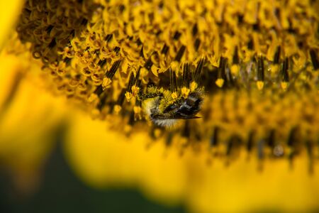Honey bee covered with yellow pollen collecting nectar in flower. Animal is sitting collecting in sunny summer sunflower. Important for environment ecology sustainability. Awareness of climate change.
