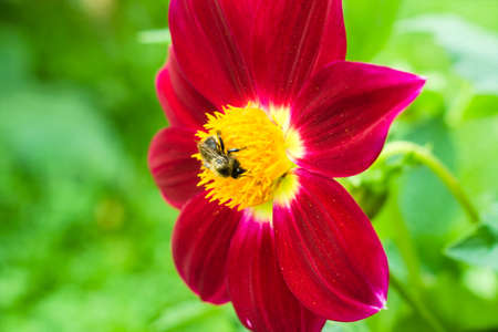 A bee collects nectar on a red dahlia flower. Pollinating insects