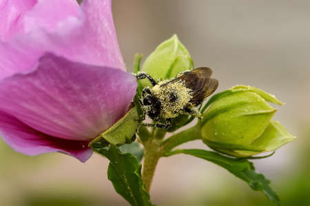 Honey bee covered with yellow pollen drink nectar, pollinating flower. Inspirational natural floral spring or summer blooming garden background. Life of insects, Extreme macro close up selective focus