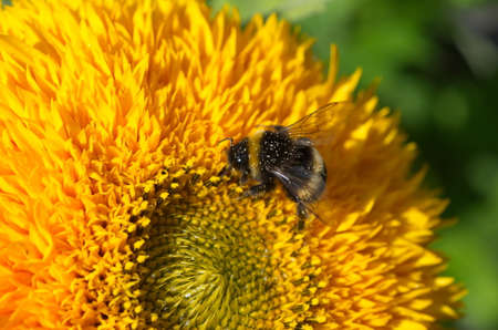 Bumblebee sits on a flower and eats nectar. Summer bright macro shot. Copyspace.