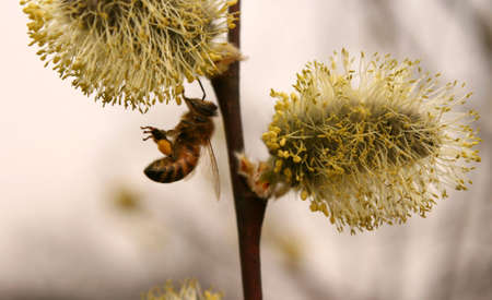 The bee collects pollen on the flowering tree. Bee on catkins. Yellow pollen on twigs and on bee.(Multiple Values)