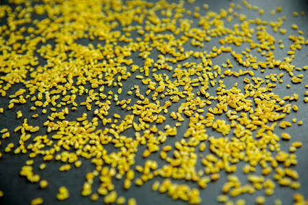 Bee pollen in a wooden spoon healthy food supplements. dark table background. ball or pellet of field-gathered flower pollen packed by worker honeybees