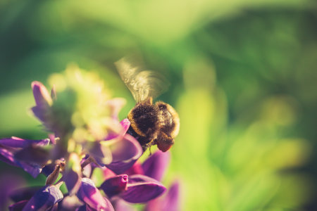 Bumble Bee pollinating and collecting nectar from a Lupin flower in the garden at the Sunset. Shallow debth of field